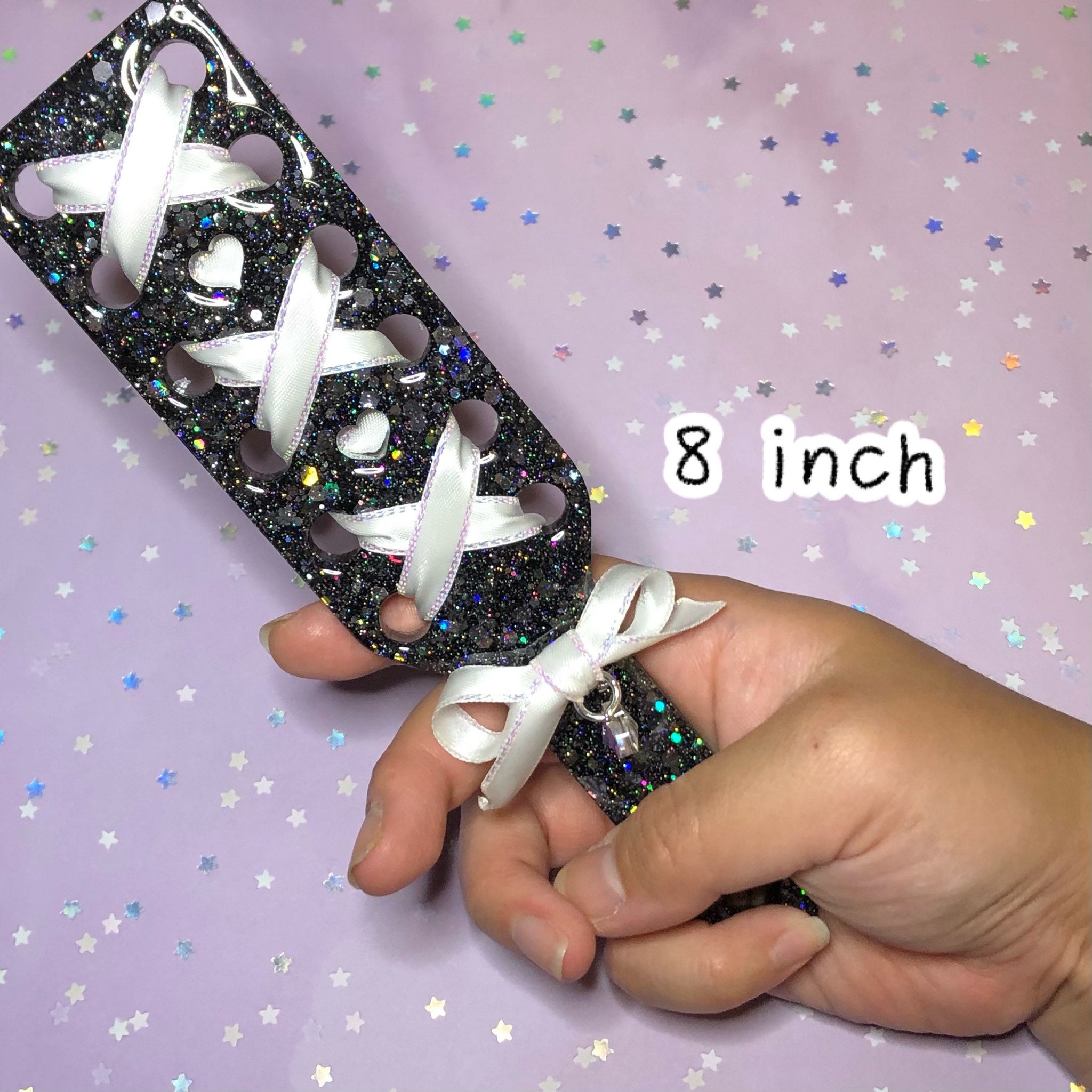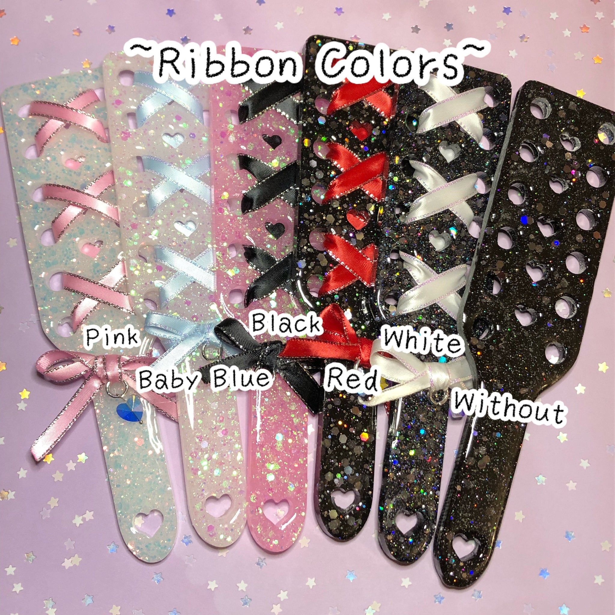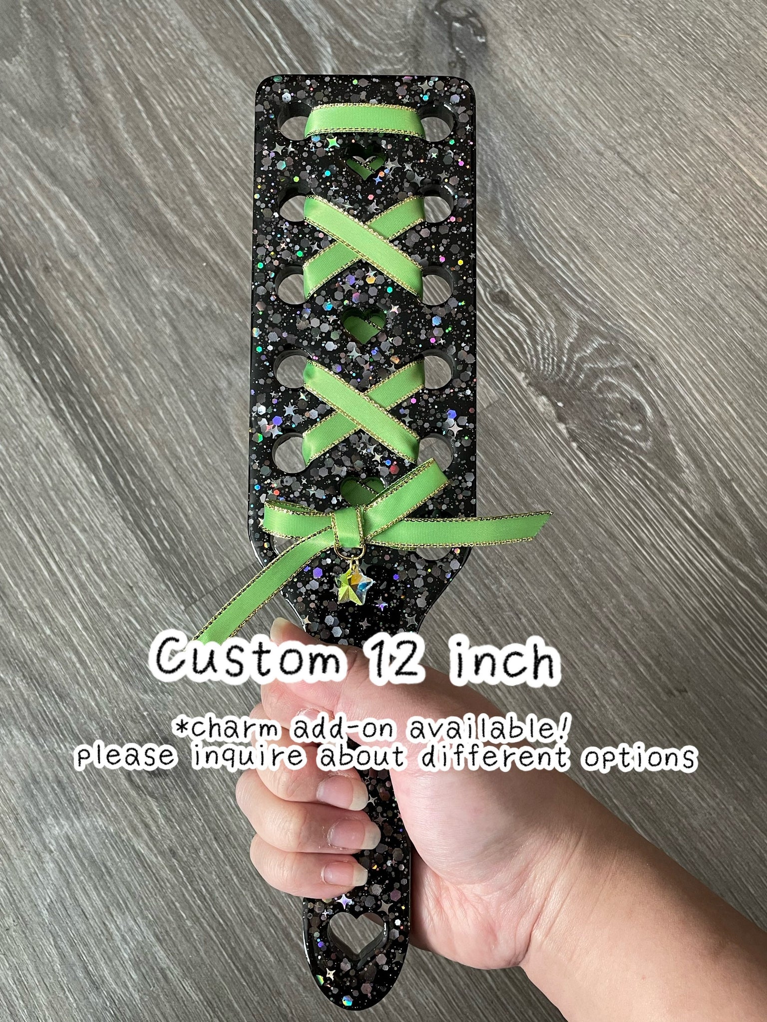 Paddle made from resin and glitter with a decorative optional ribbon.